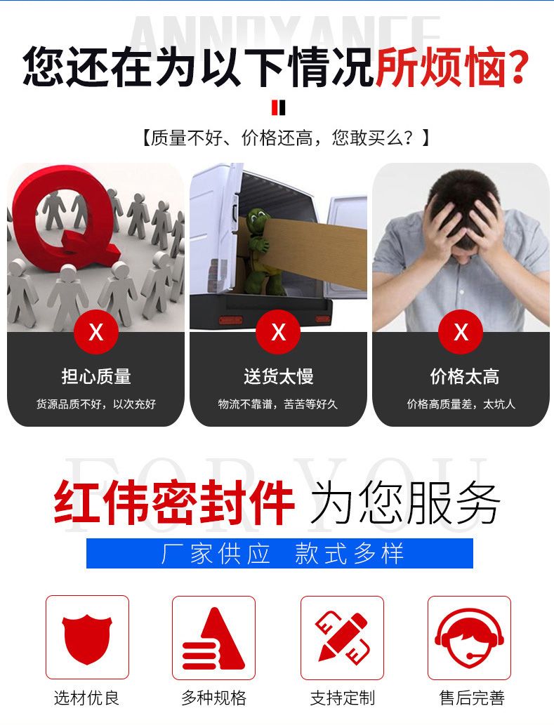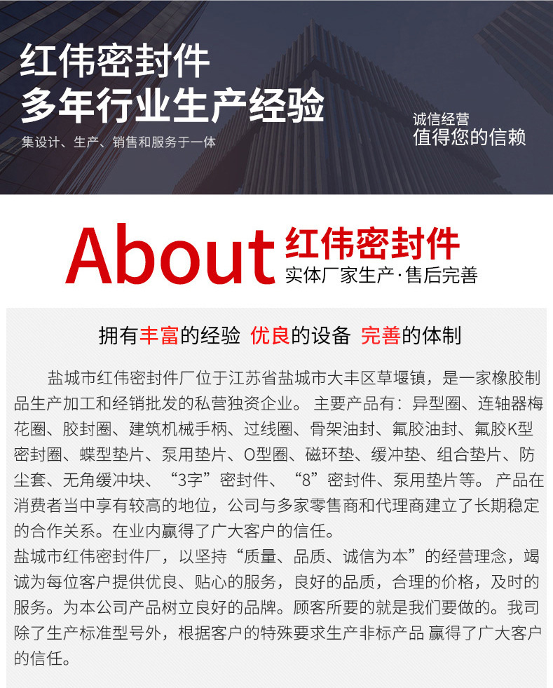 盐城市红伟密封件厂位于江苏省盐城市大丰区草堰镇,是一家橡胶制品生产加工和经销批发的私营独资企业。 主要产品有:异型圈、连轴器 梅花圈、胶封圈、建筑机械手柄、过线圈、骨架油封、氟胶油封、氟胶K型密封圈、蝶型垫片、泵用垫片、O型圈、磁环垫、缓冲垫、组合垫片、防尘套、无角缓冲块、“3字”密封件、“8”密封件、泵用垫片等。 产品在消费者当中享有较高的地位,公司与多家零售商和代理商建立了长期稳定的合作关系。在业内赢得了广大客户的信任。